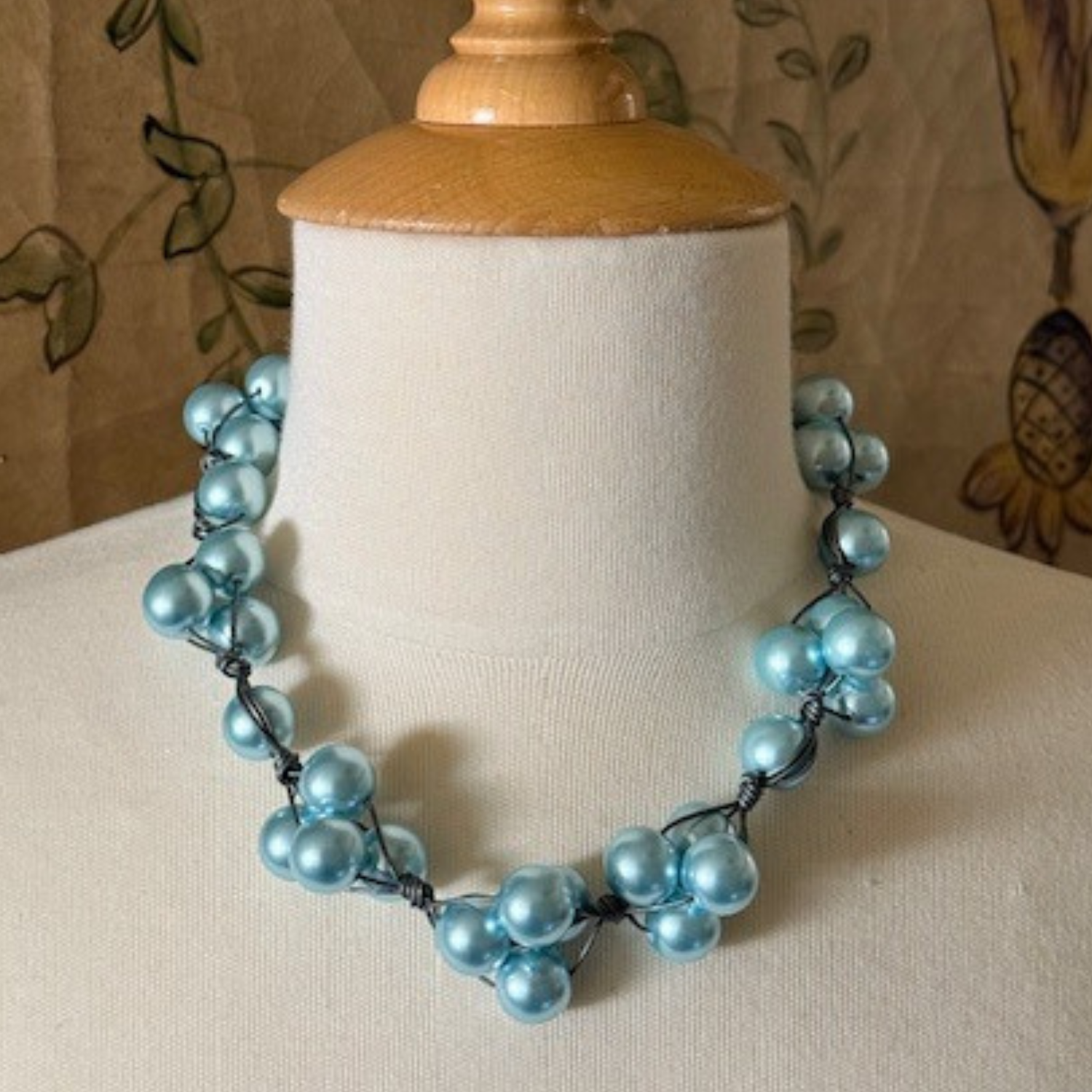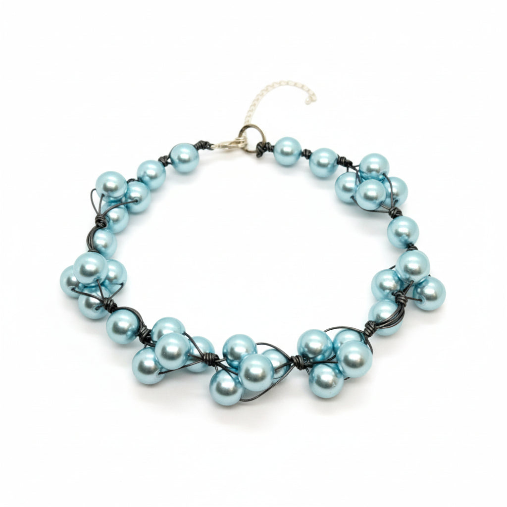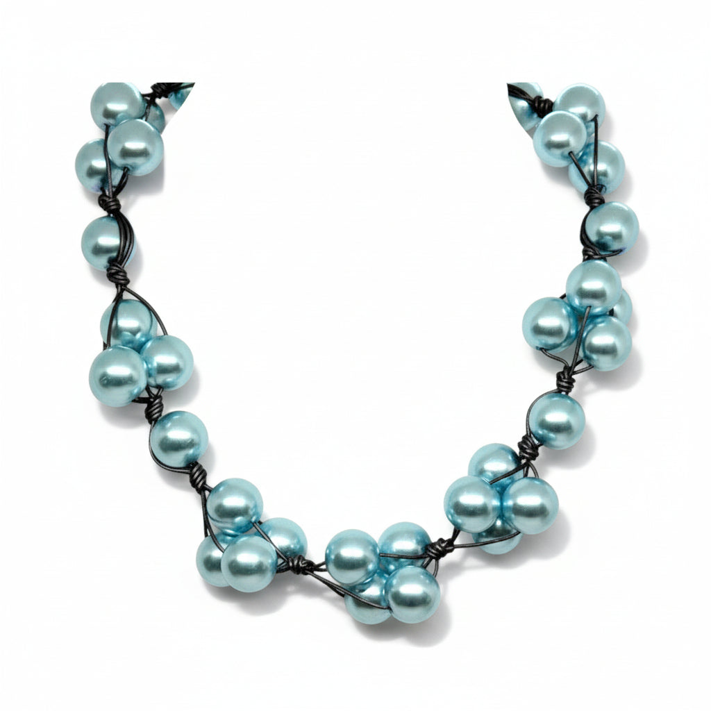 Lustrous 14mm aqua glass pearls are meticulously woven onto platinum leather to form this beautiful necklace.
