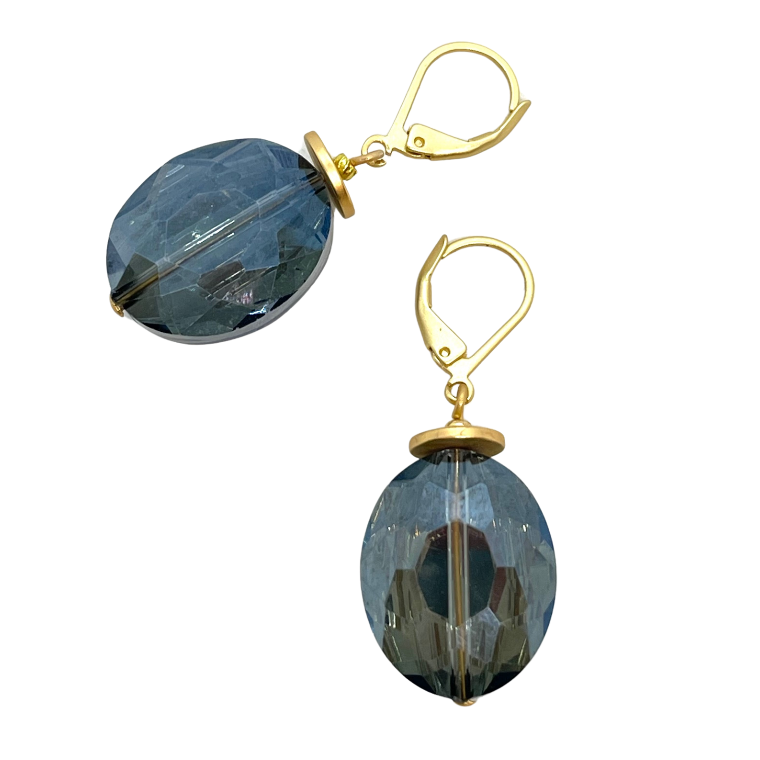 Labradorite Blue Crystal Earrings with Matte Gold Disc Accent on Lever Back