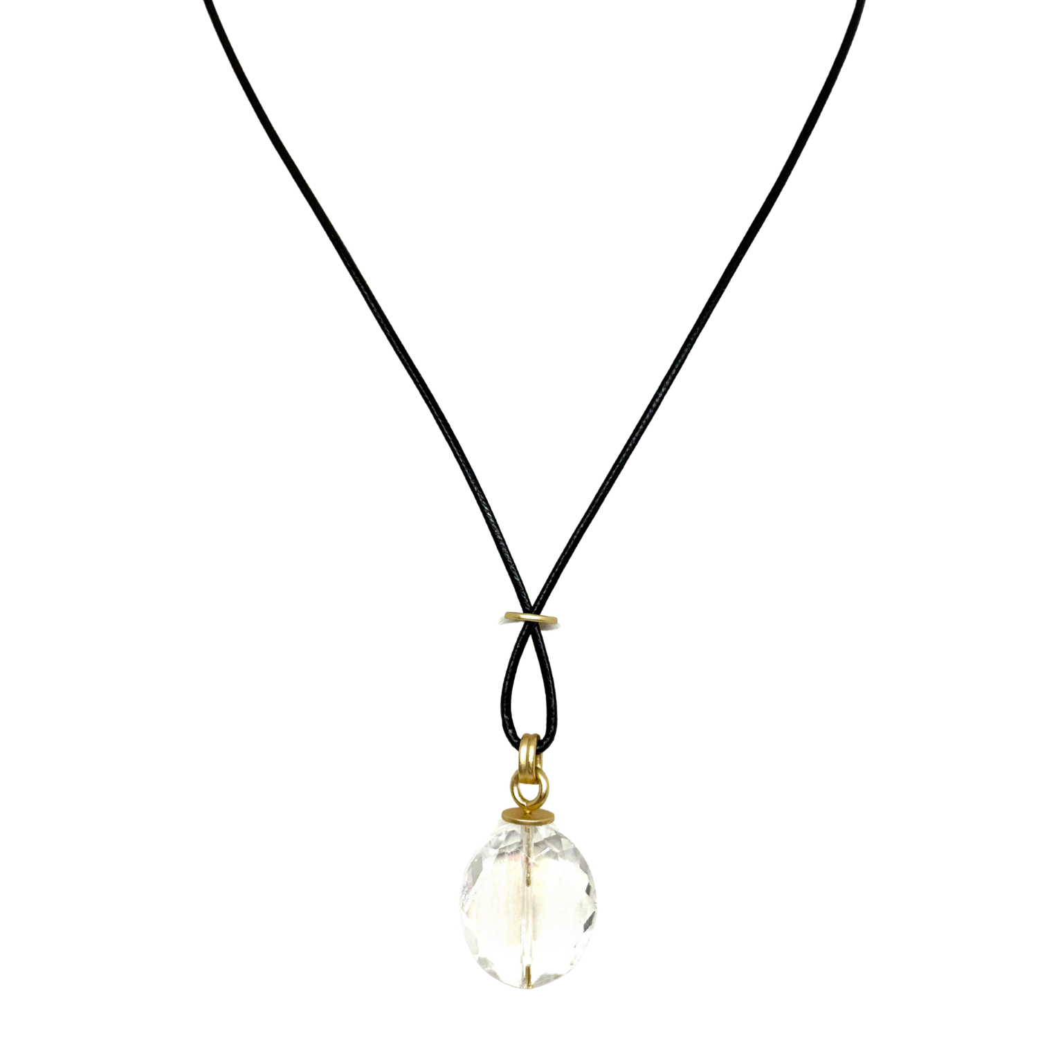 This 16" necklace showcases a large, clear oval crystal, gracefully suspended on a waxed bronze color linen cord.