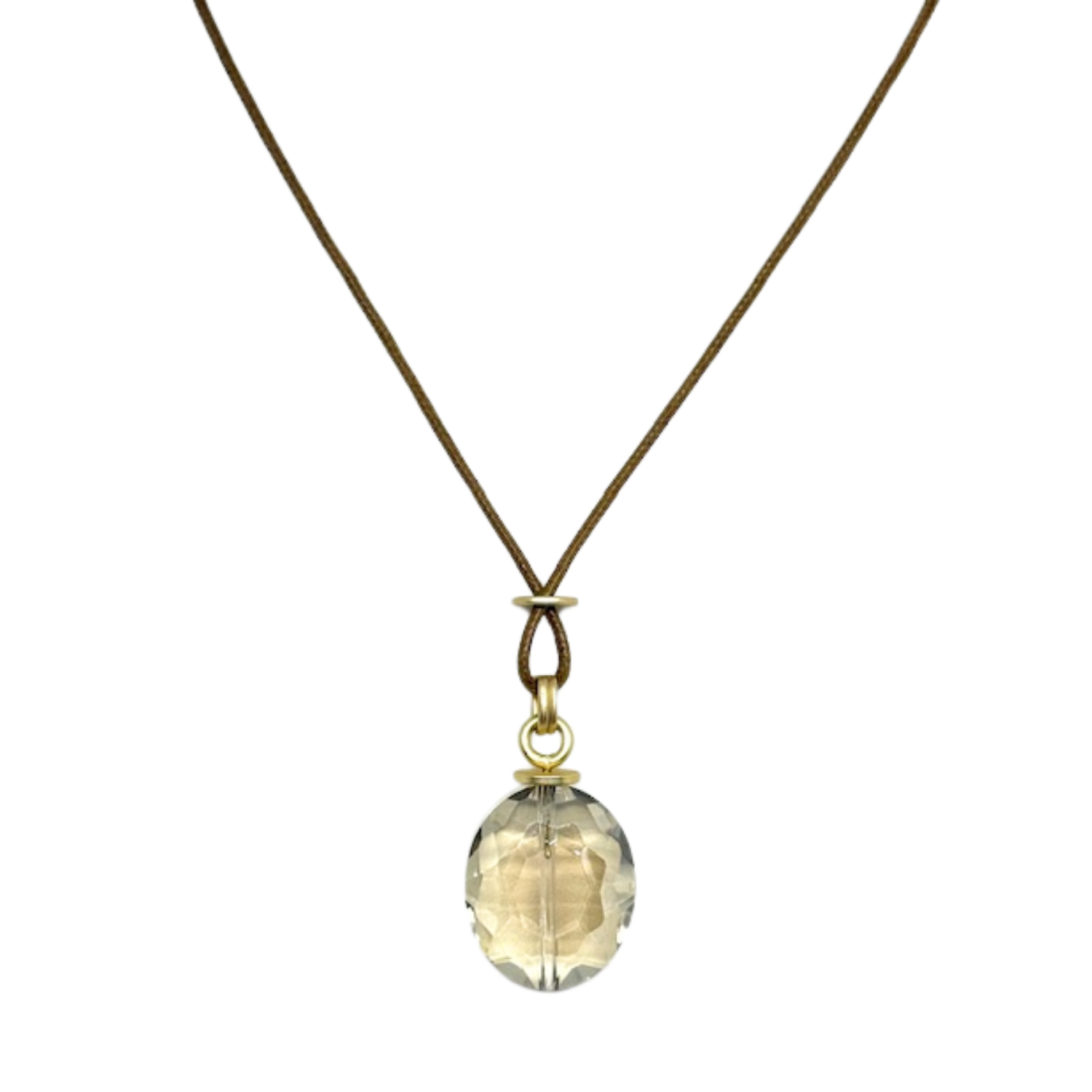 This 16" necklace showcases a large champagne oval crystal, gracefully suspended on a waxed bronze color linen cord.