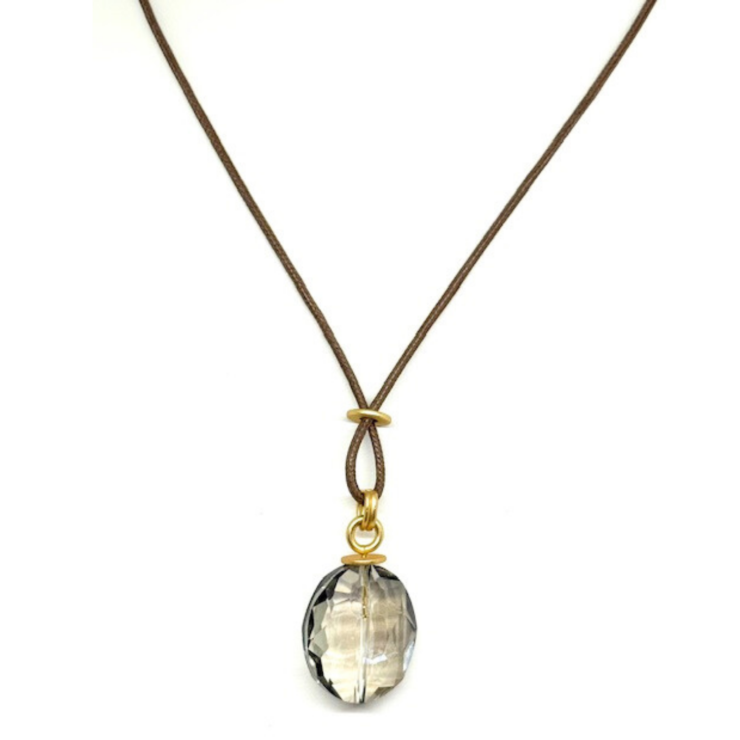 This 16" necklace showcases a large smoke topaz oval crystal, gracefully suspended on a waxed chocolate color linen cord.