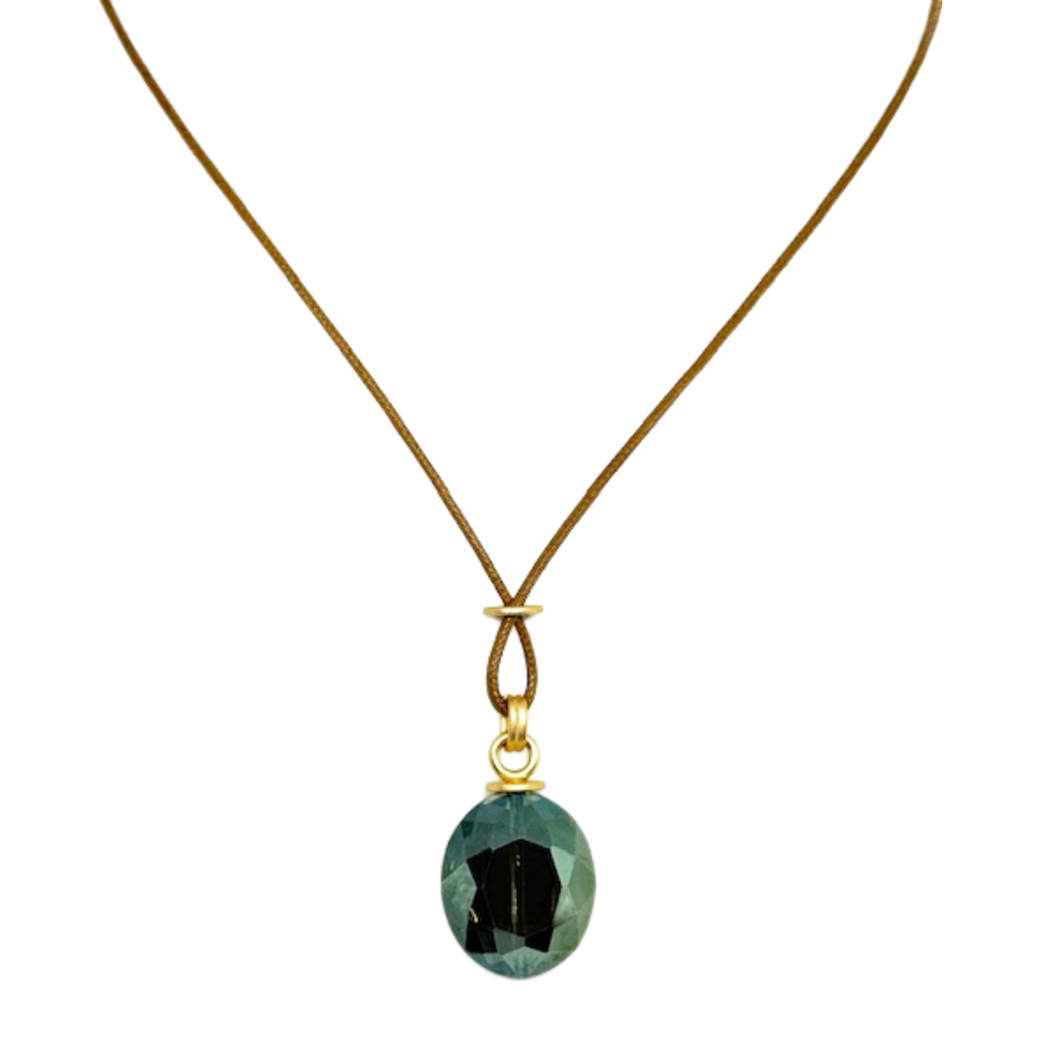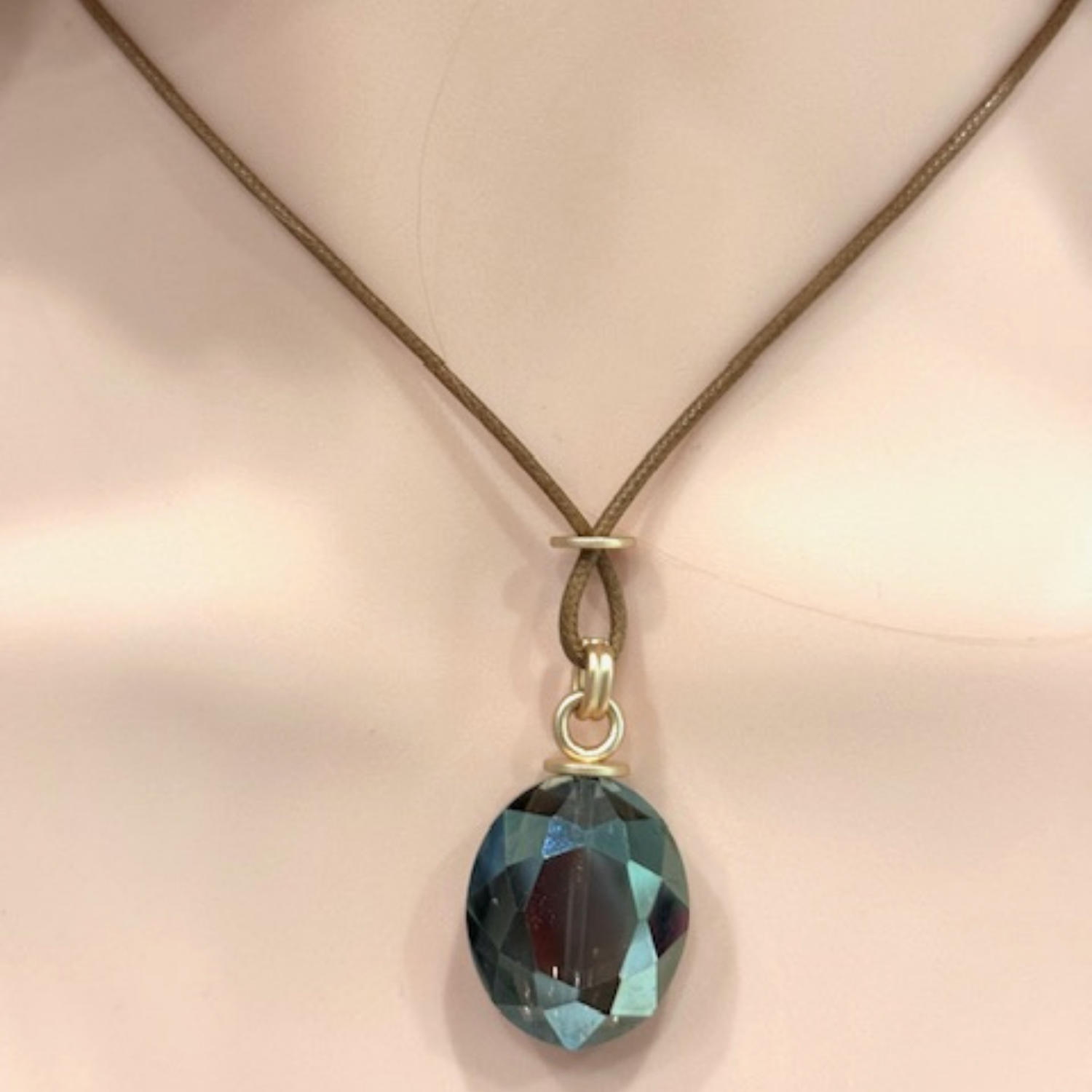 This 16" necklace showcases a large olive oval crystal, gracefully suspended on a waxed natural color linen cord.
