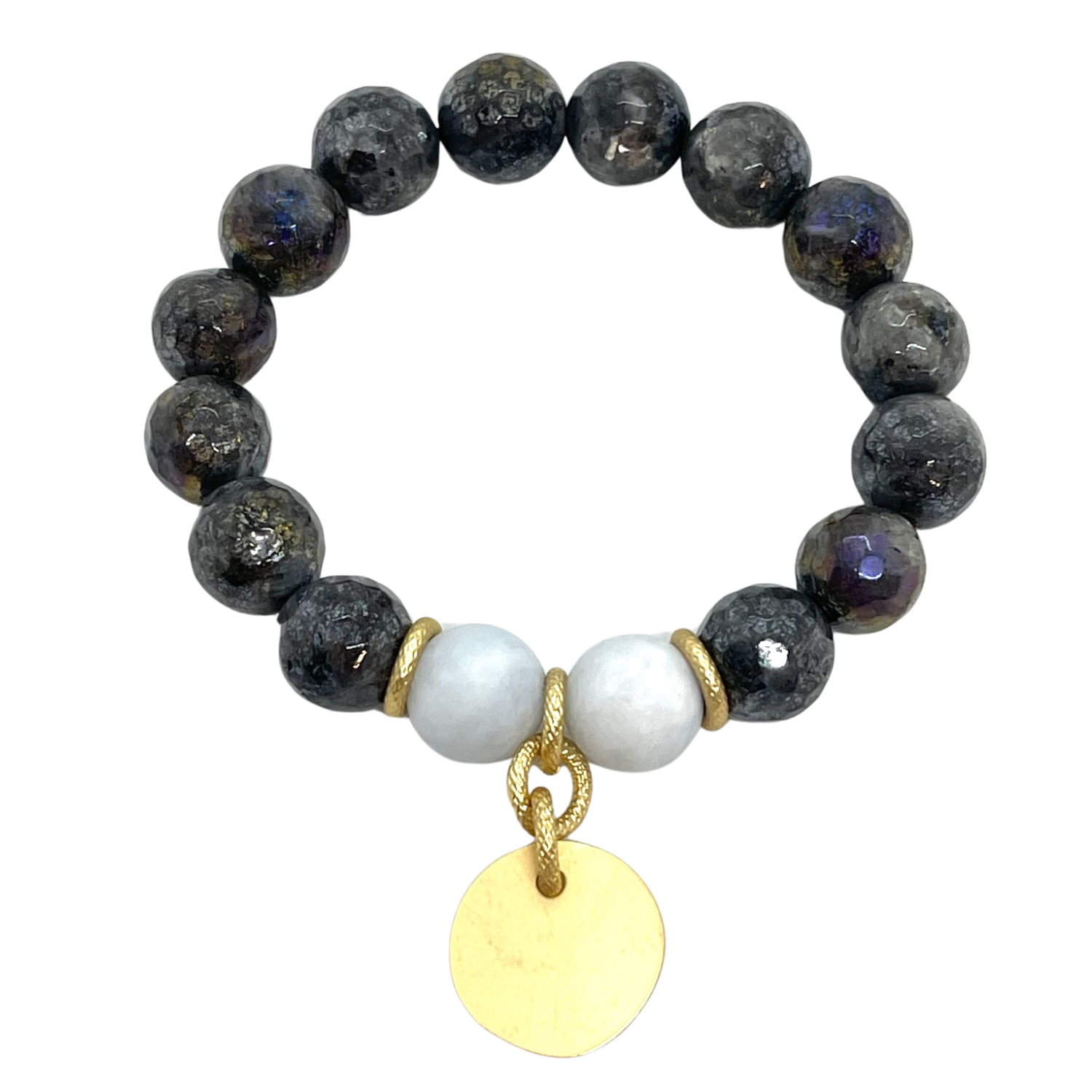 Lavakite and Matte Aquamarine Stretch Bracelet With Matte Gold Circle Charm