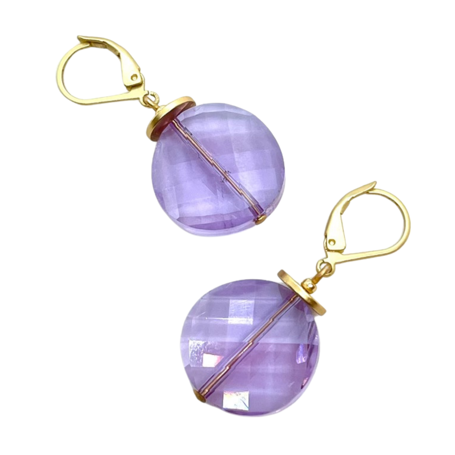 Lavender Coin Crystal Earrings with Matte Gold Disc Accent on Lever Back