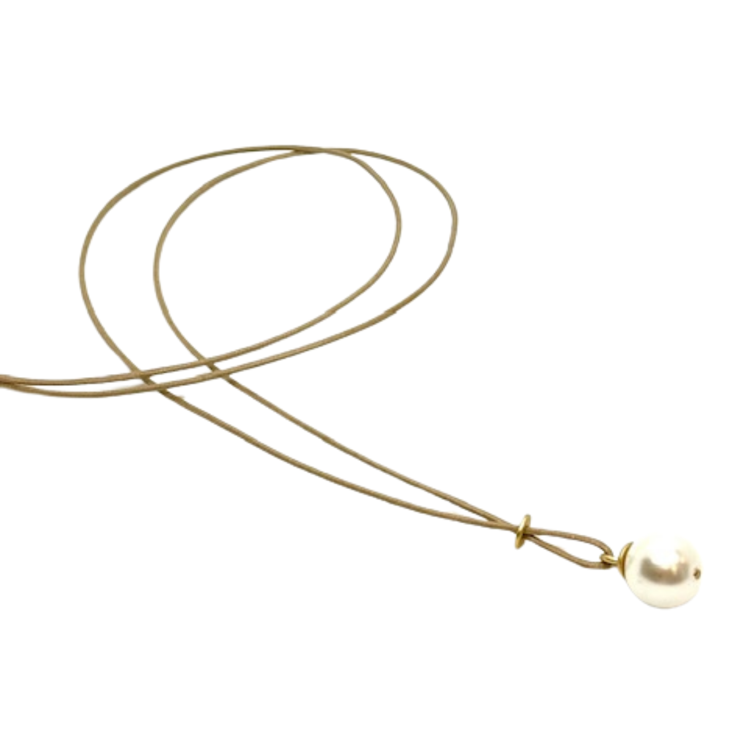 Long (36") natural-toned cord necklace featuring a criss-cross design and highlighted by a prominent large white pearl pendant.