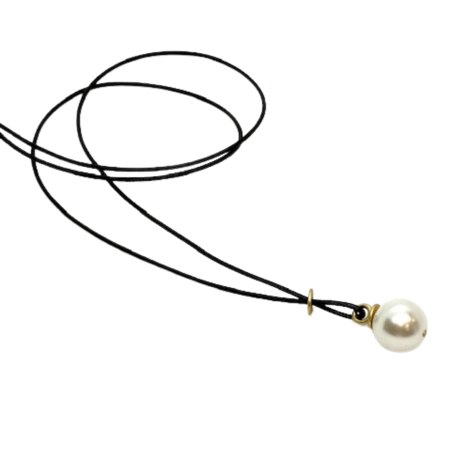 Long black waxed linen cord necklace featuring a criss-cross design and highlighted by a prominent large white pearl pendant.