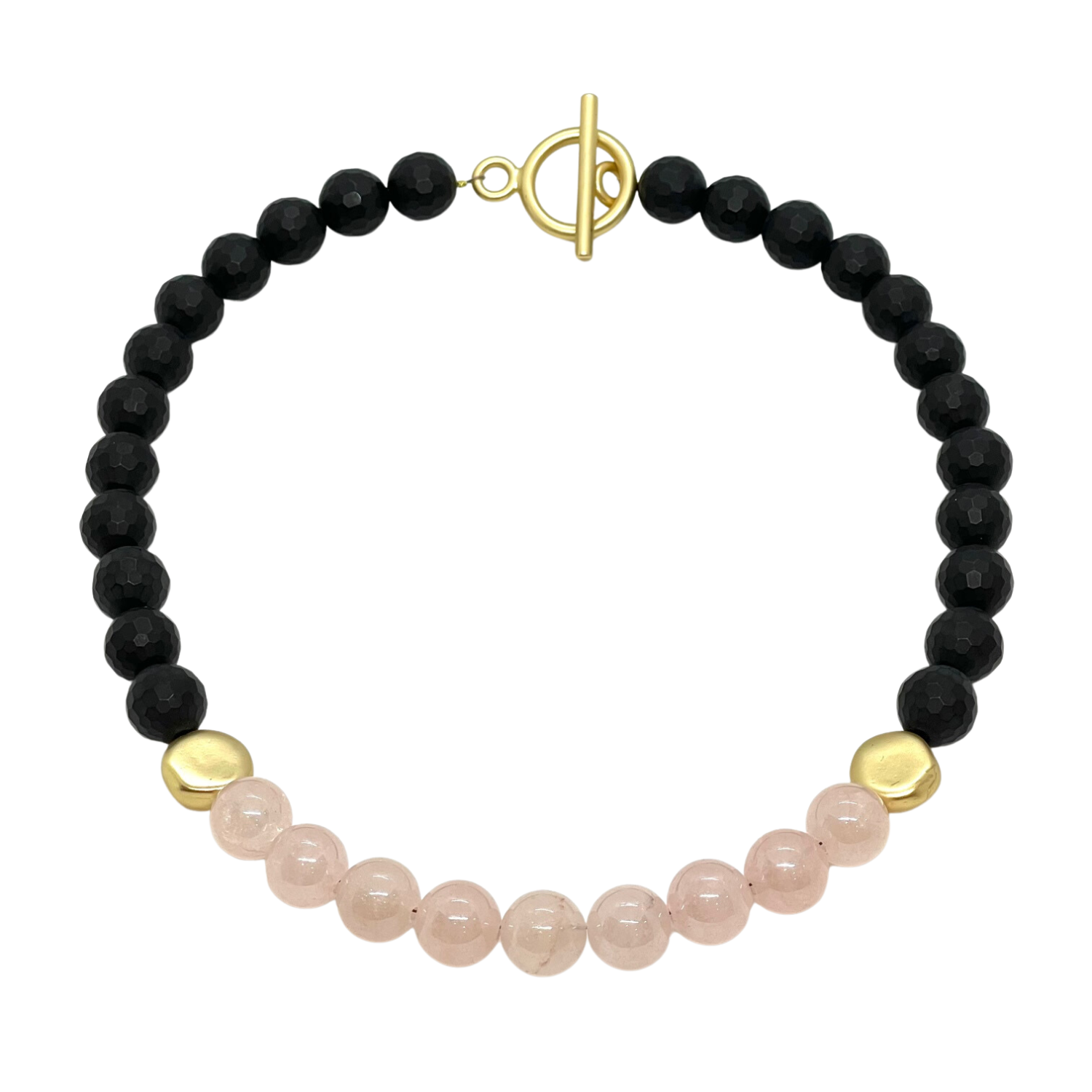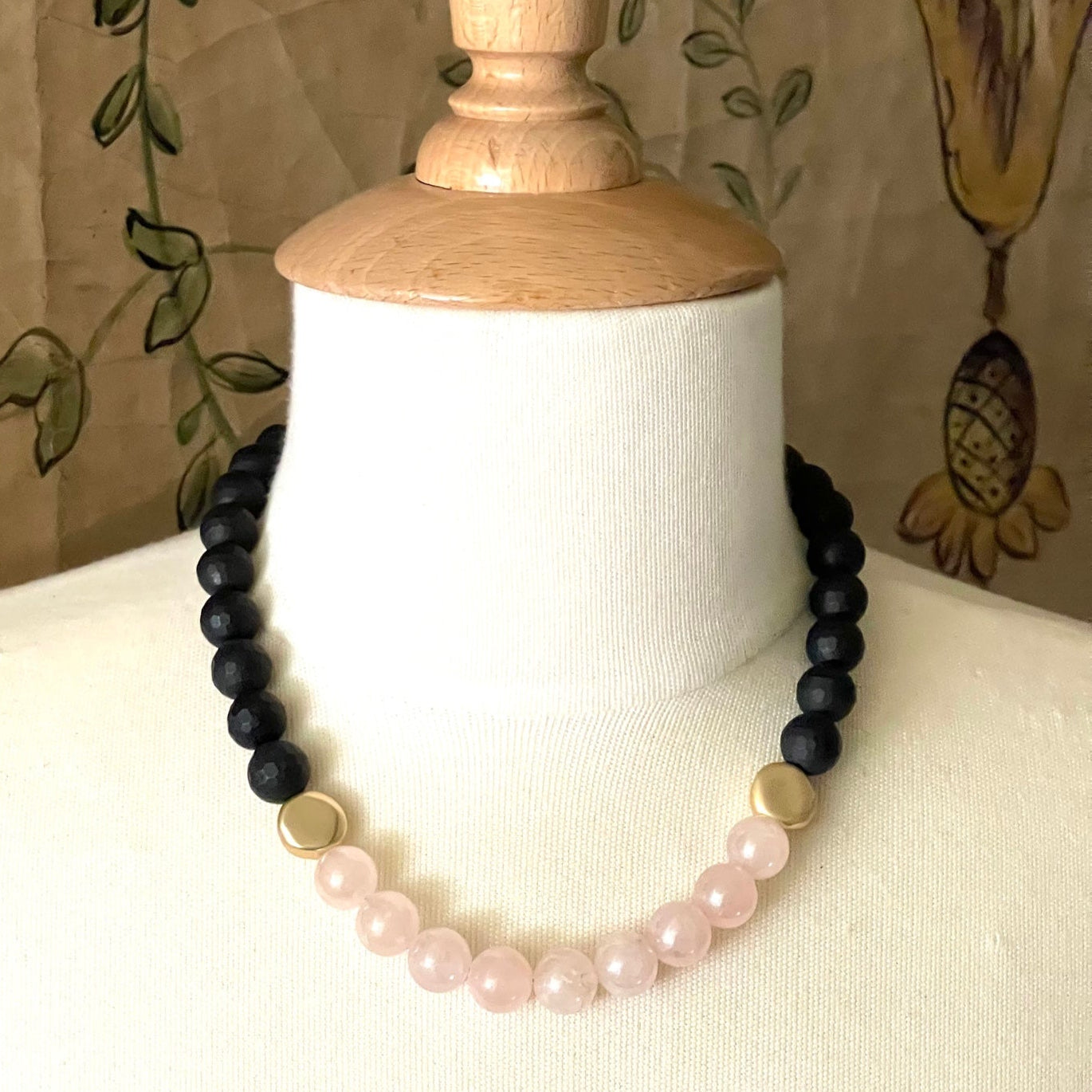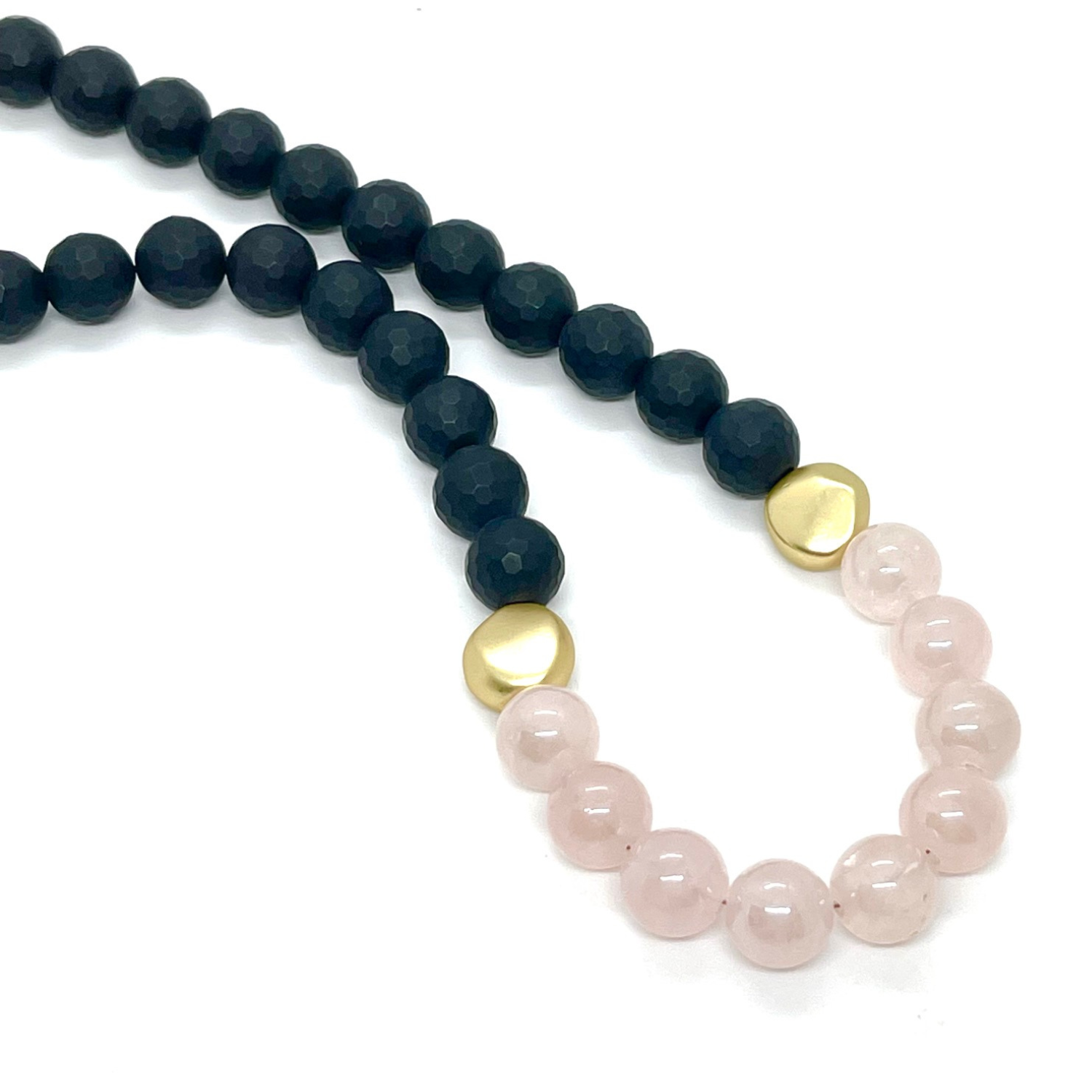 Matte Black Onyx And Rose Quartz Front Accent Necklace With Matte Gold Beads