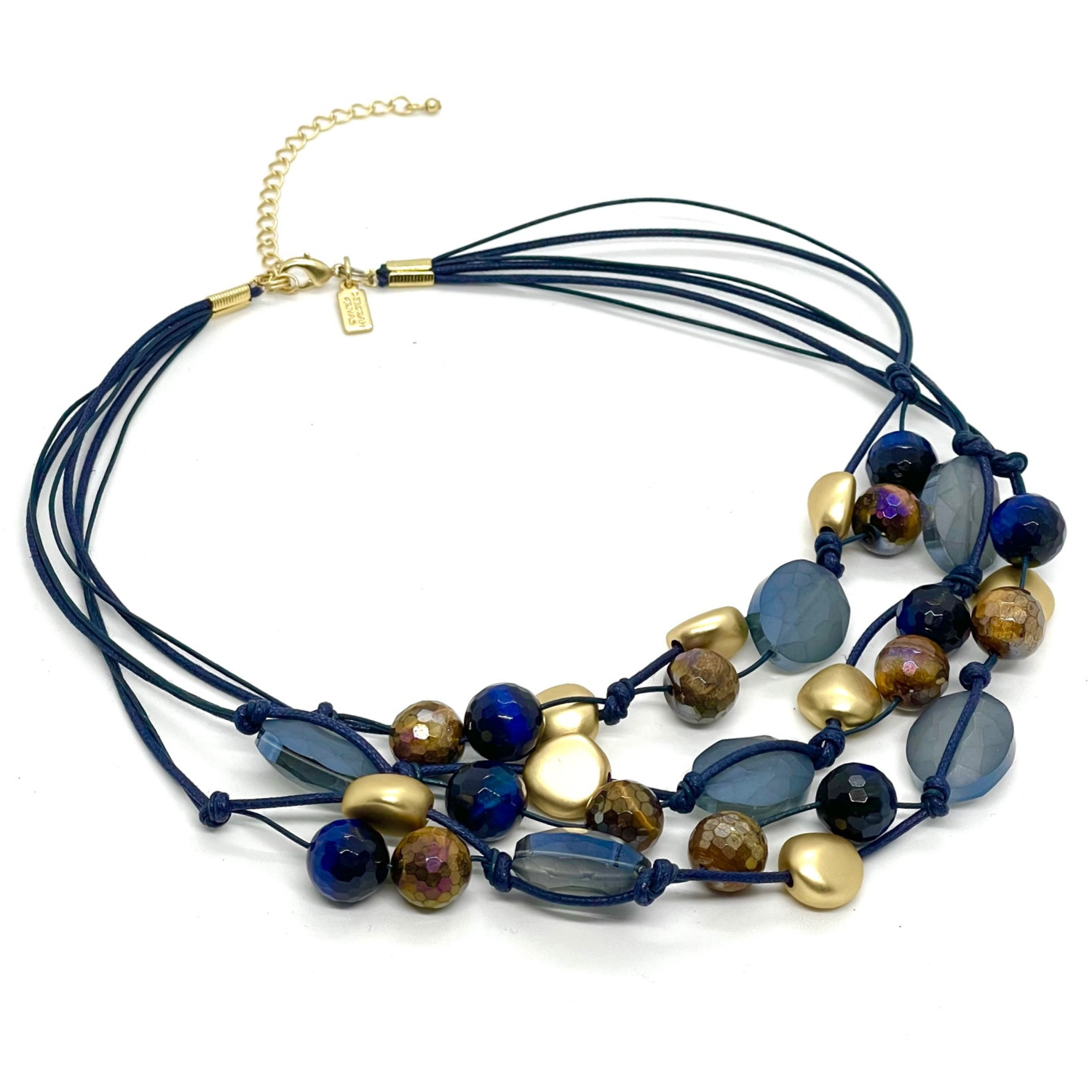 Matte Blue Crystal, Blue, And Brown Tigers Eye With Matte Gold Beads On Bronze Leather And Linen Torsade Necklace