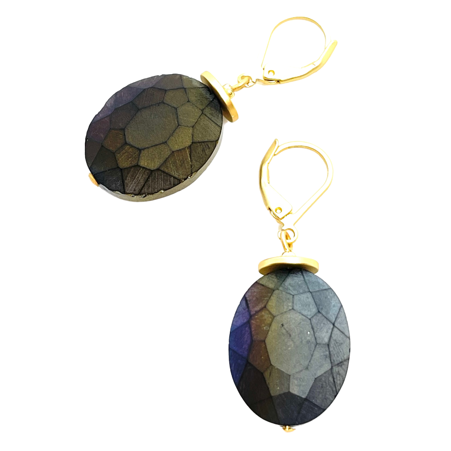 Matte Grey Faceted Crystal Earrings with Matte Gold Disc Accent on Lever Back