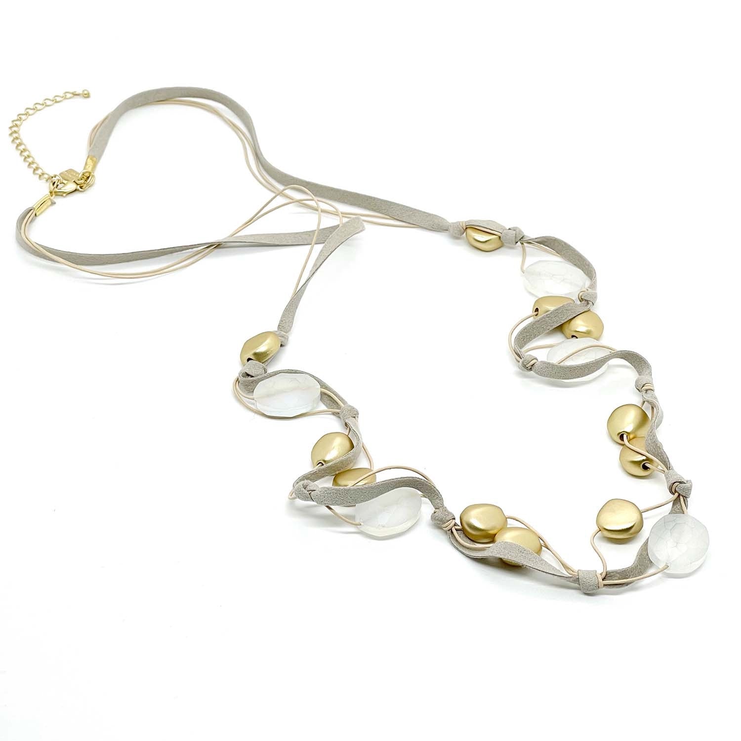Matte White Crystal and Matte Gold Bead Natural Suede And Putty Leather Layer Necklace