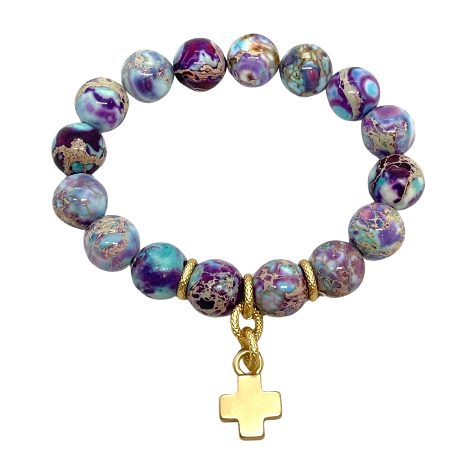Multi Jasper With Matte Gold Cross Stretch Bracelet