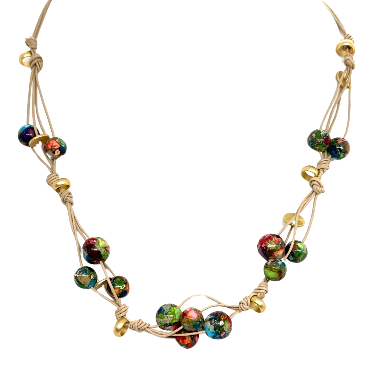 Multi Jasper With Matte Gold Accents Woven Necklace On Natural Leather