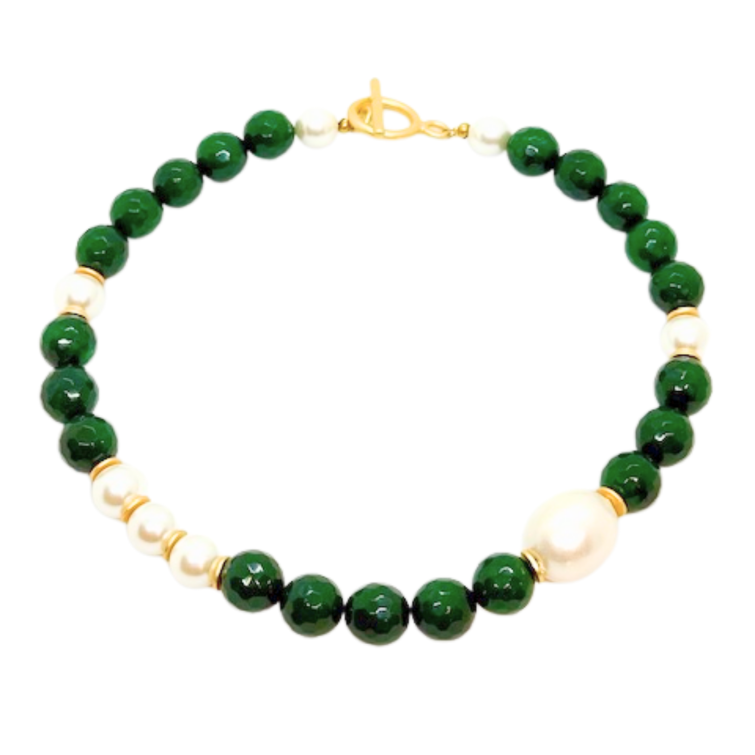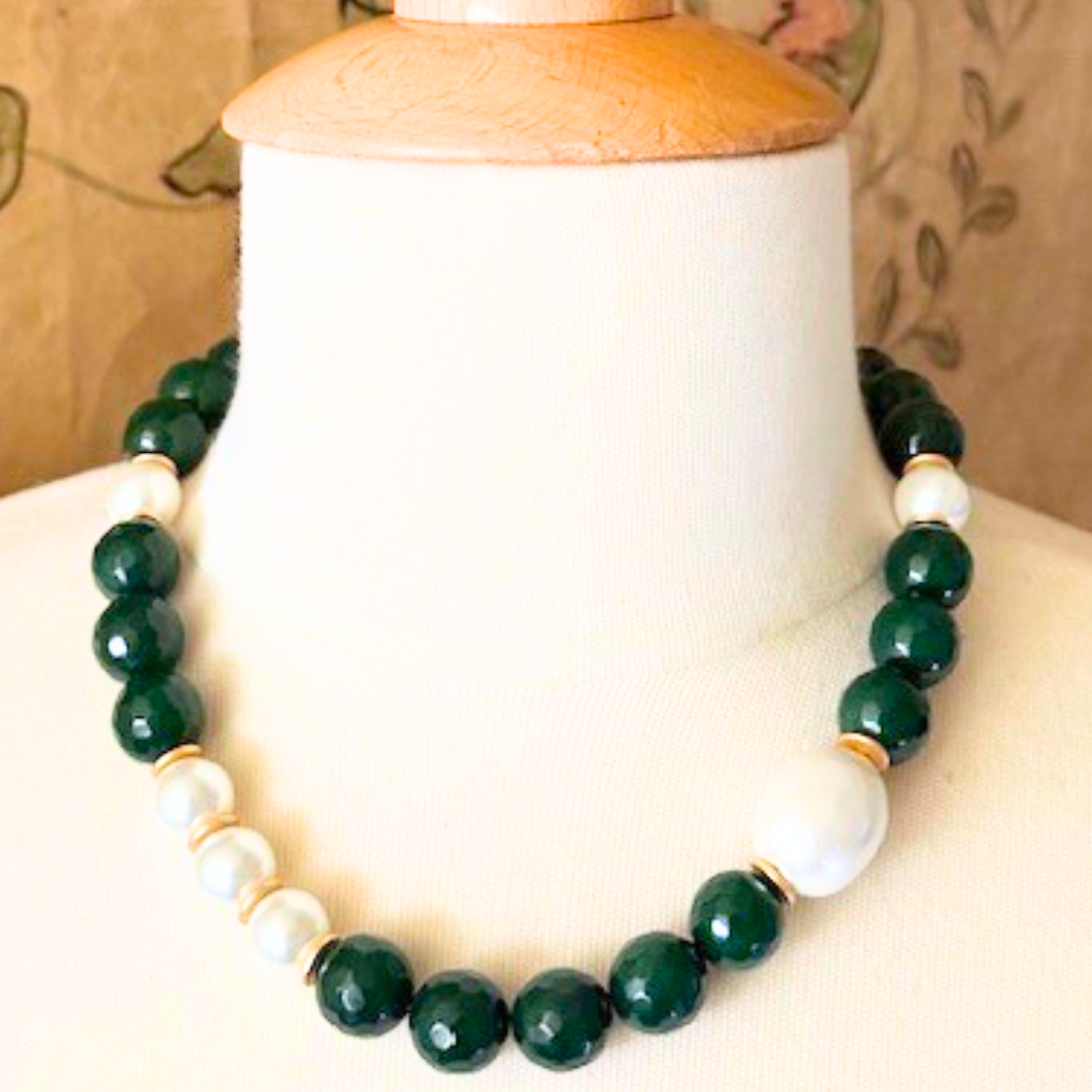 This necklace features vibrant green jade beads paired with soft cotton pearls and shimmering glass pearls.