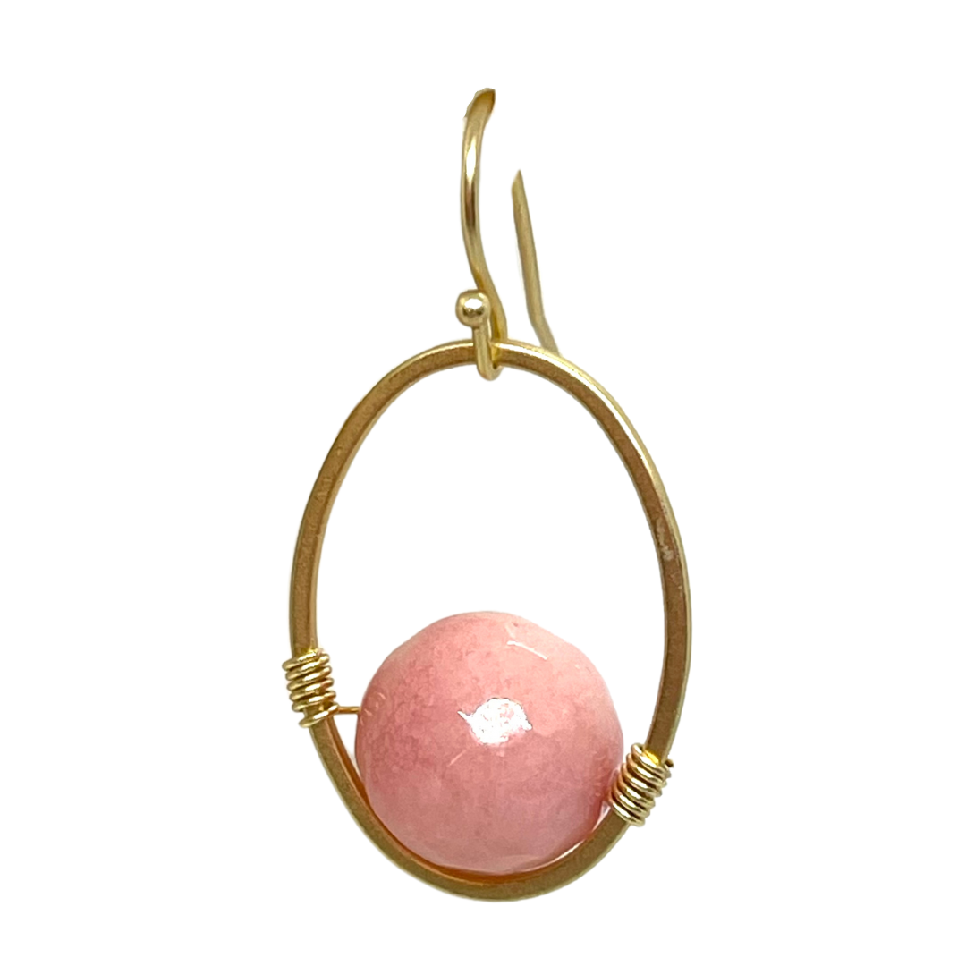 Pink Coral Jade And Matte Gold Wire Wrap Oval Earrings
