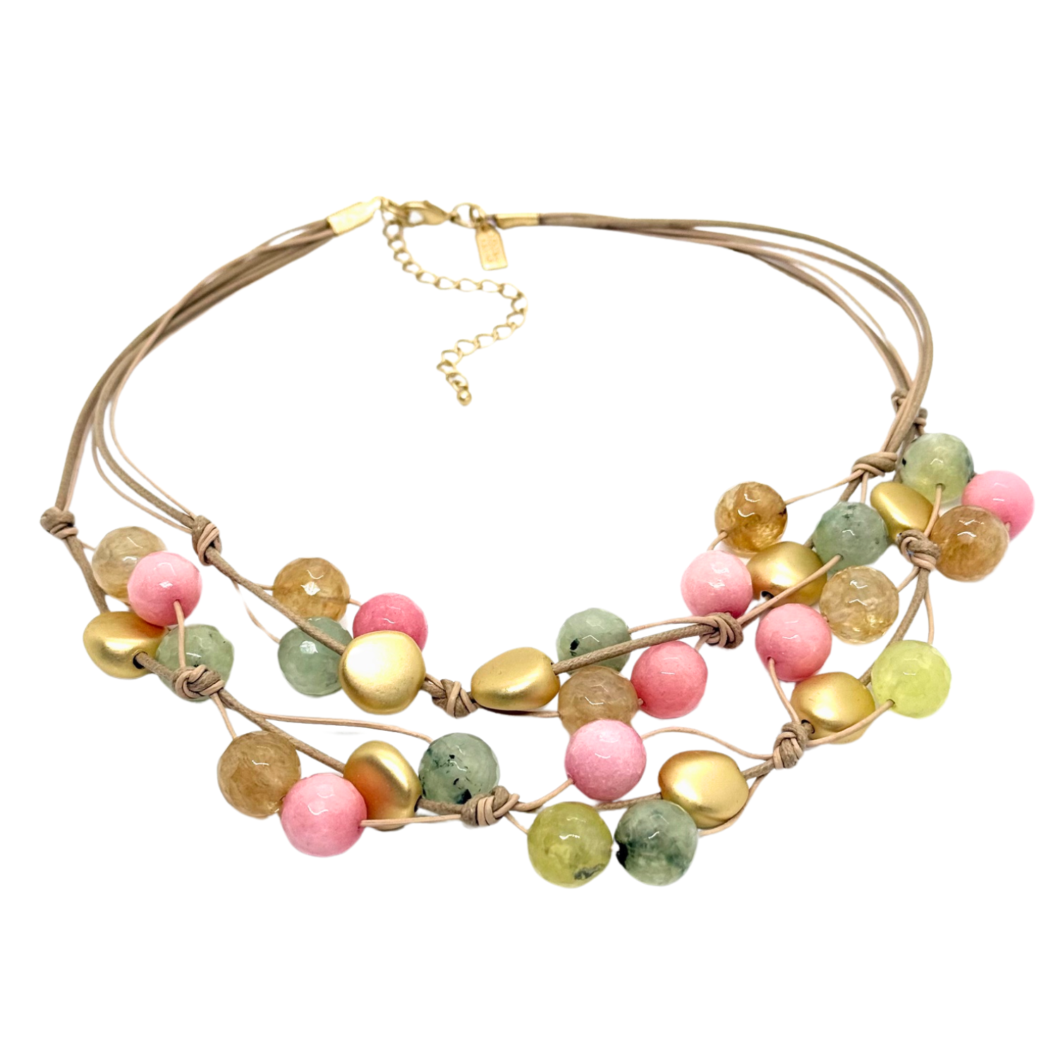 Pink Jade, Prehnite, And Citrine Quartz Two Strand Woven Necklace with Gold Nugget Accents on Natural Leather and Linen