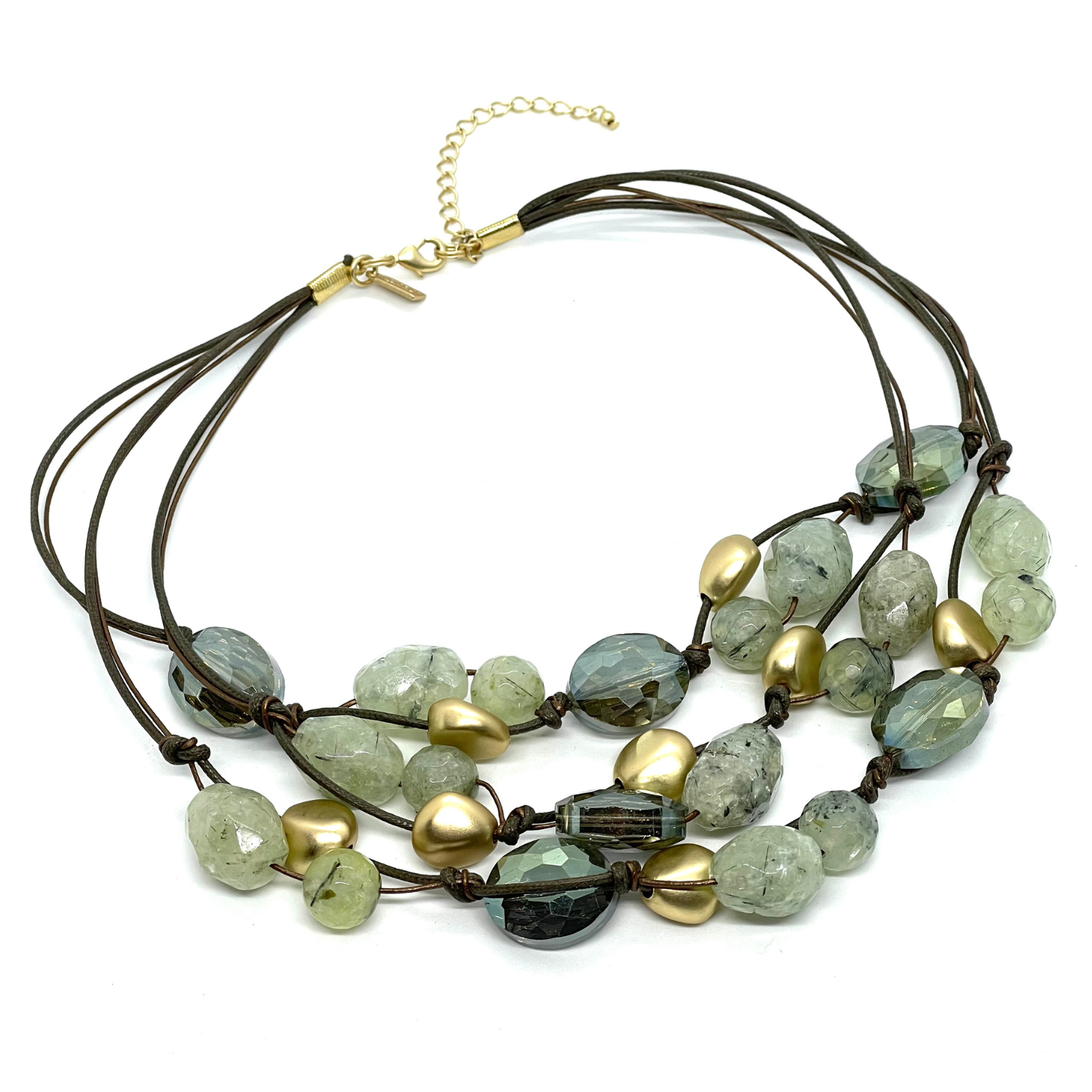 Olive Crystal and Prehnite Torsade with Gold Nugget on Olive Linen and Bronze Leather