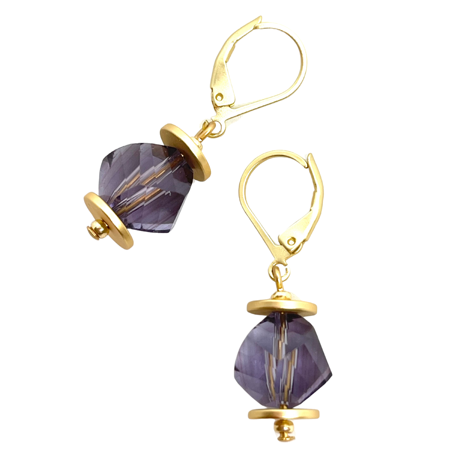 Purple Slice Crystal Earrings with Matte Gold Saucer Accents on Lever Backs