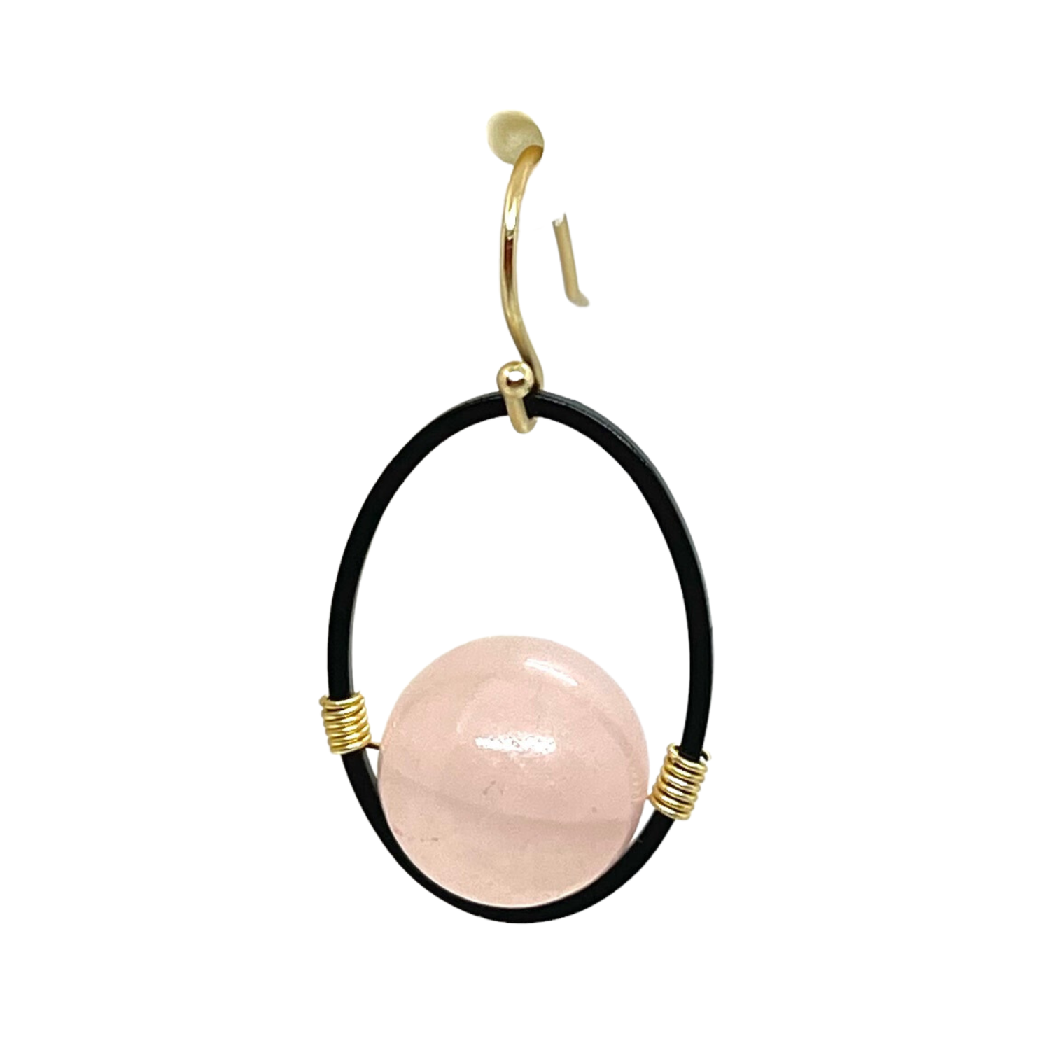 Rose Quartz And Matte Black Oval Gold Wire Wrap Earrings