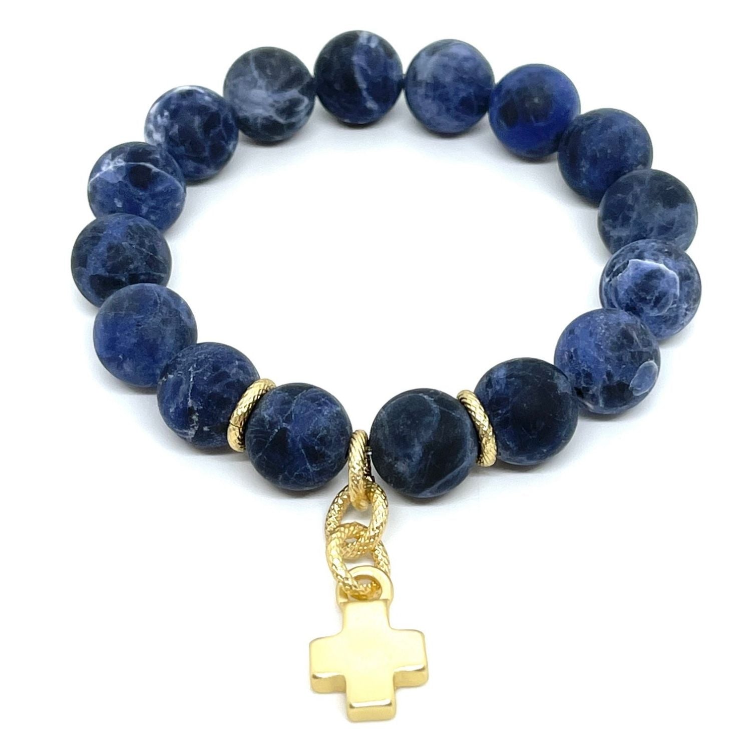 Matte Sodalite Stretch Bracelet With Matte Gold Cross Charm