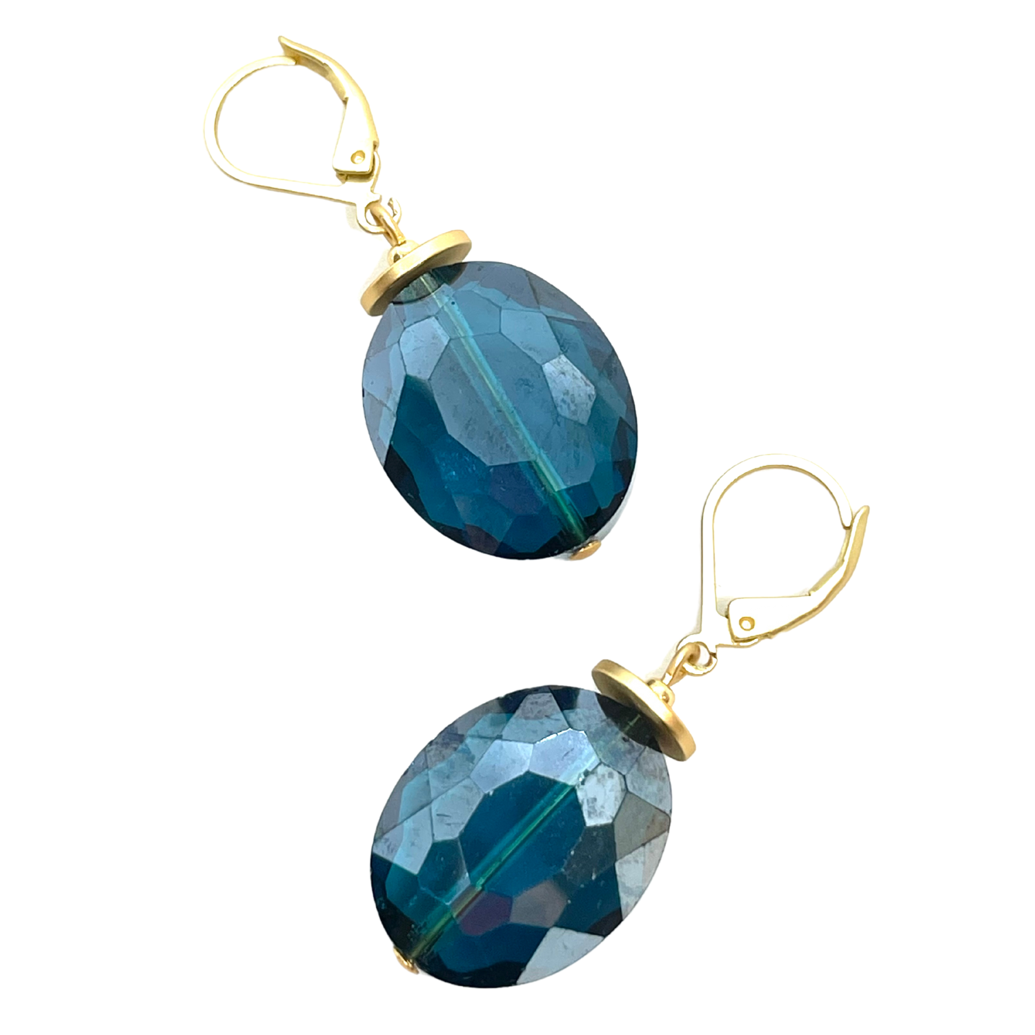Teal Crystal Earrings with Matte Gold Disc Accent on Lever Back
