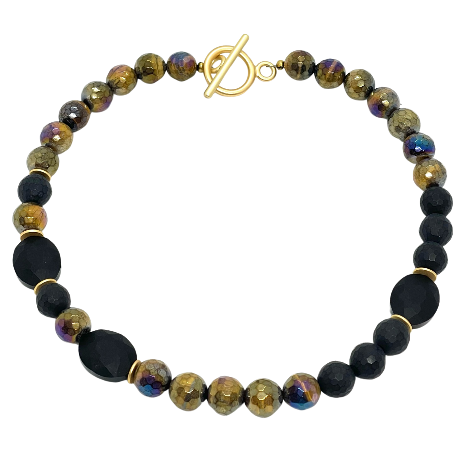 Tigers Eye, Black Onyx, and Matte Black Crystal Beaded Necklace