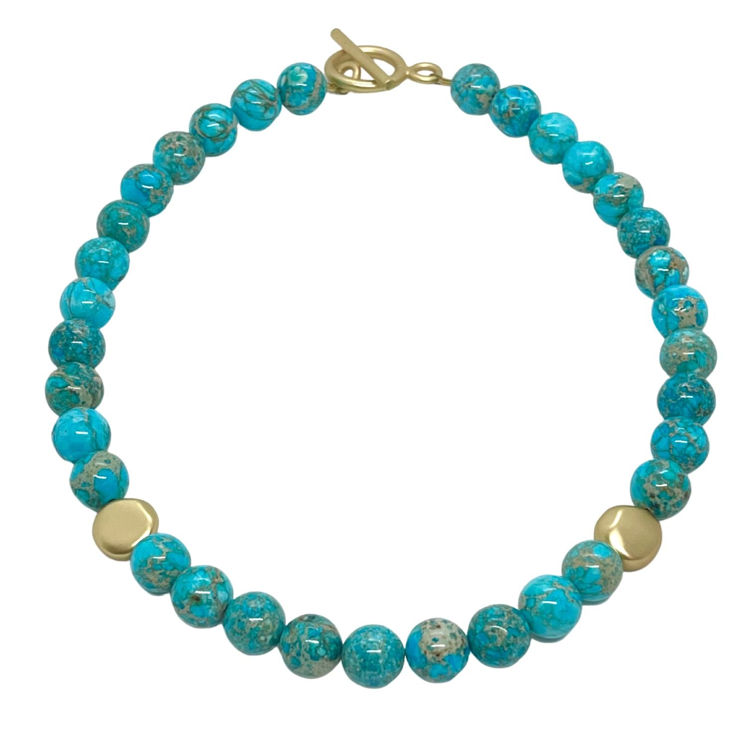 Turquoise Aqua Terra Jasper Beaded Necklace With Matte Gold Accents