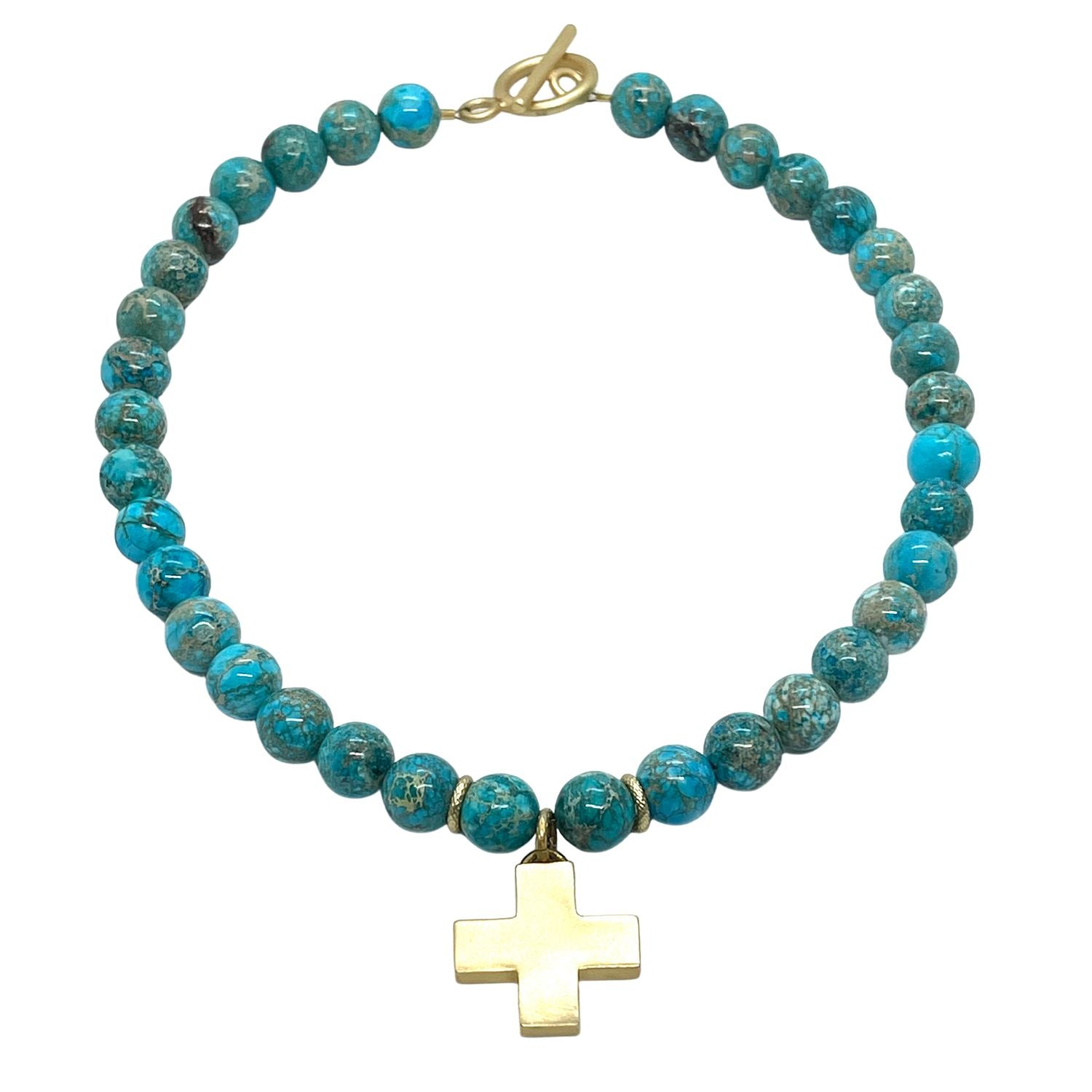 Turquoise Aqua Terra Jasper Beaded Necklace With Matte Gold Cross Pendant