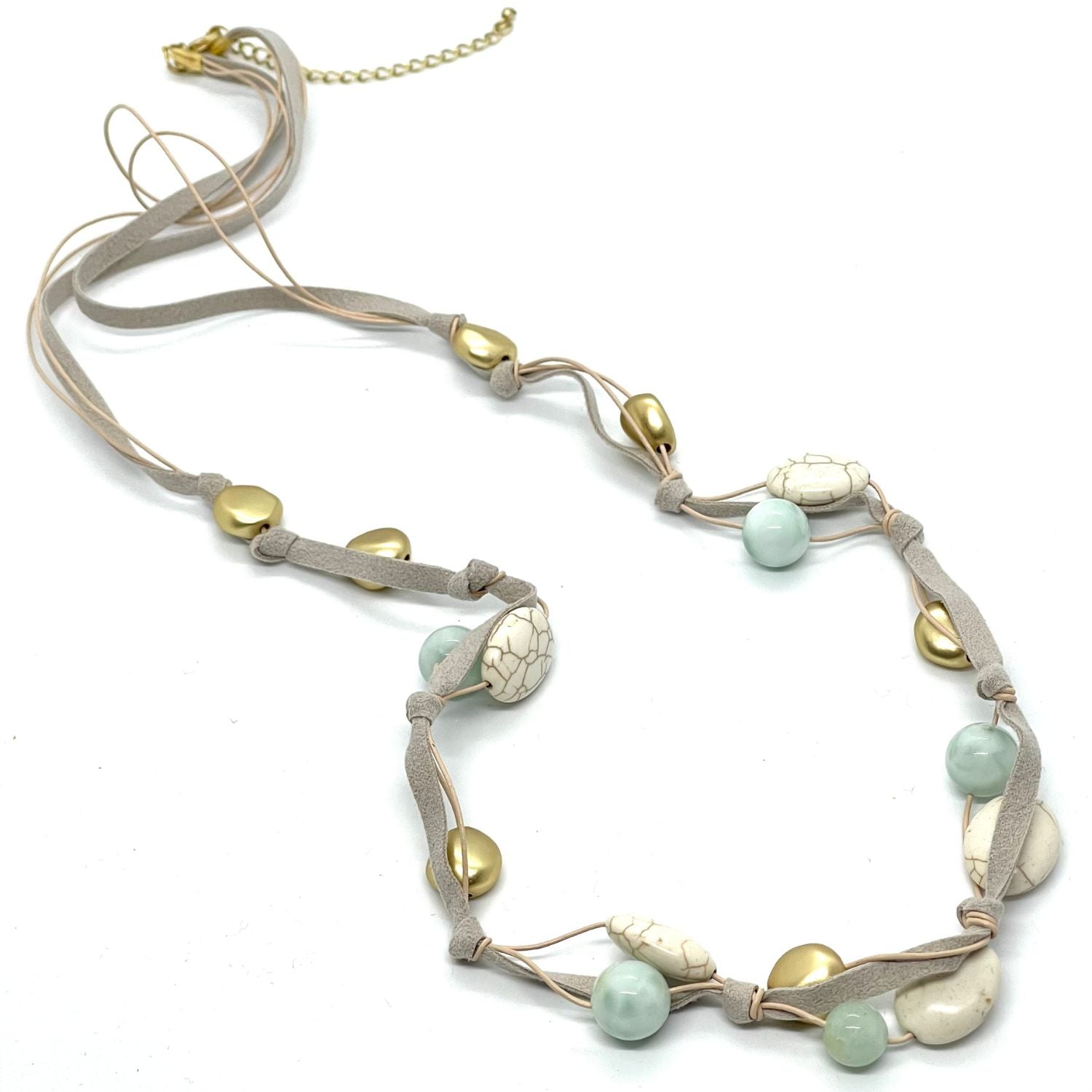 White Magnesite, Green Angelite, and Matte Gold Nugget Long Necklace on Putty Leather and Natural Suede